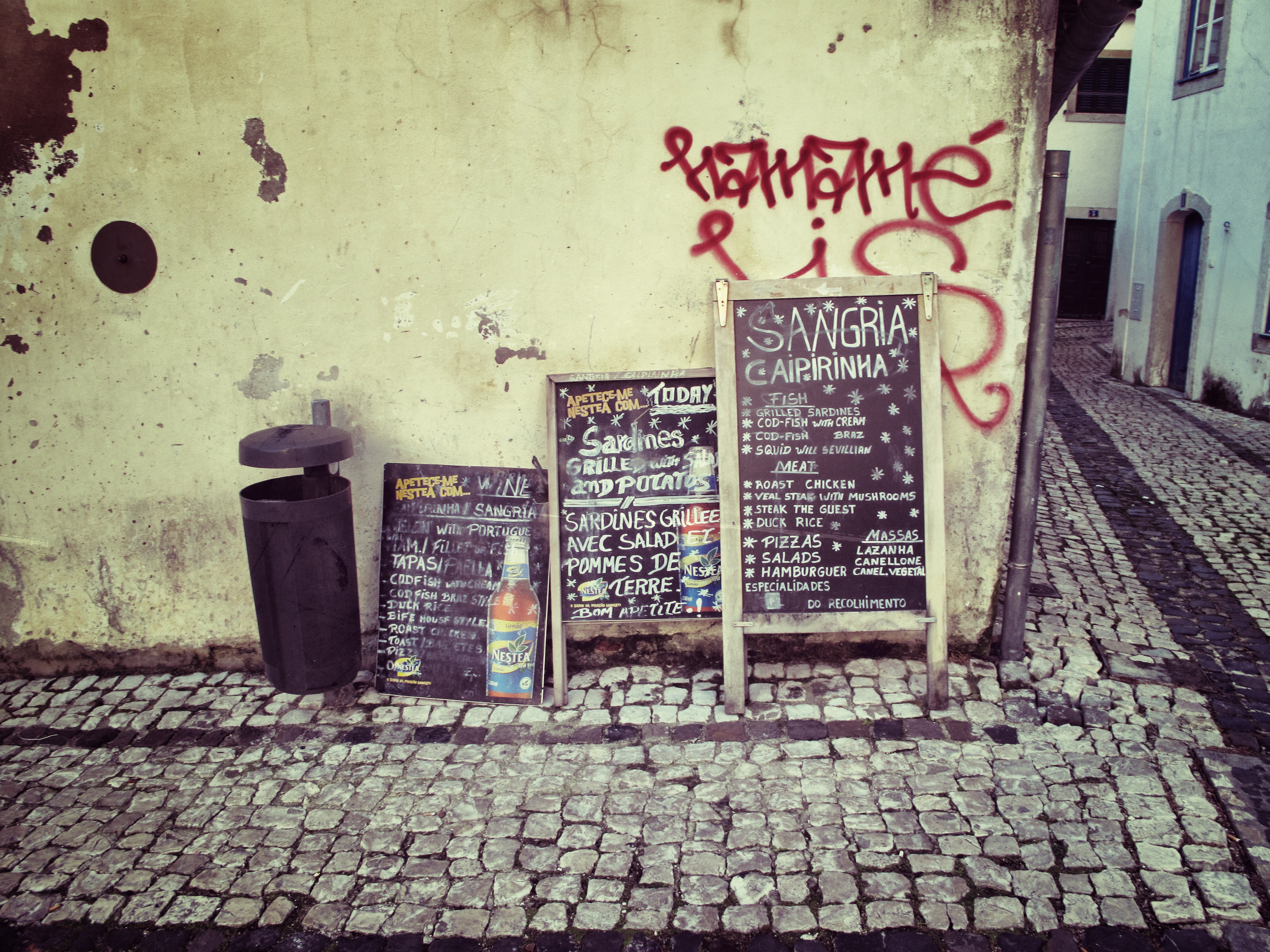 Lisboa, Alfama. We didn’t try either Sangria or Caipirinha. Wine is relatively cheap, even ordered in a restaurant (but not as cheap as in Sicily). I like Sangria, though; I must revisit Portugal to try the Portuguese one.