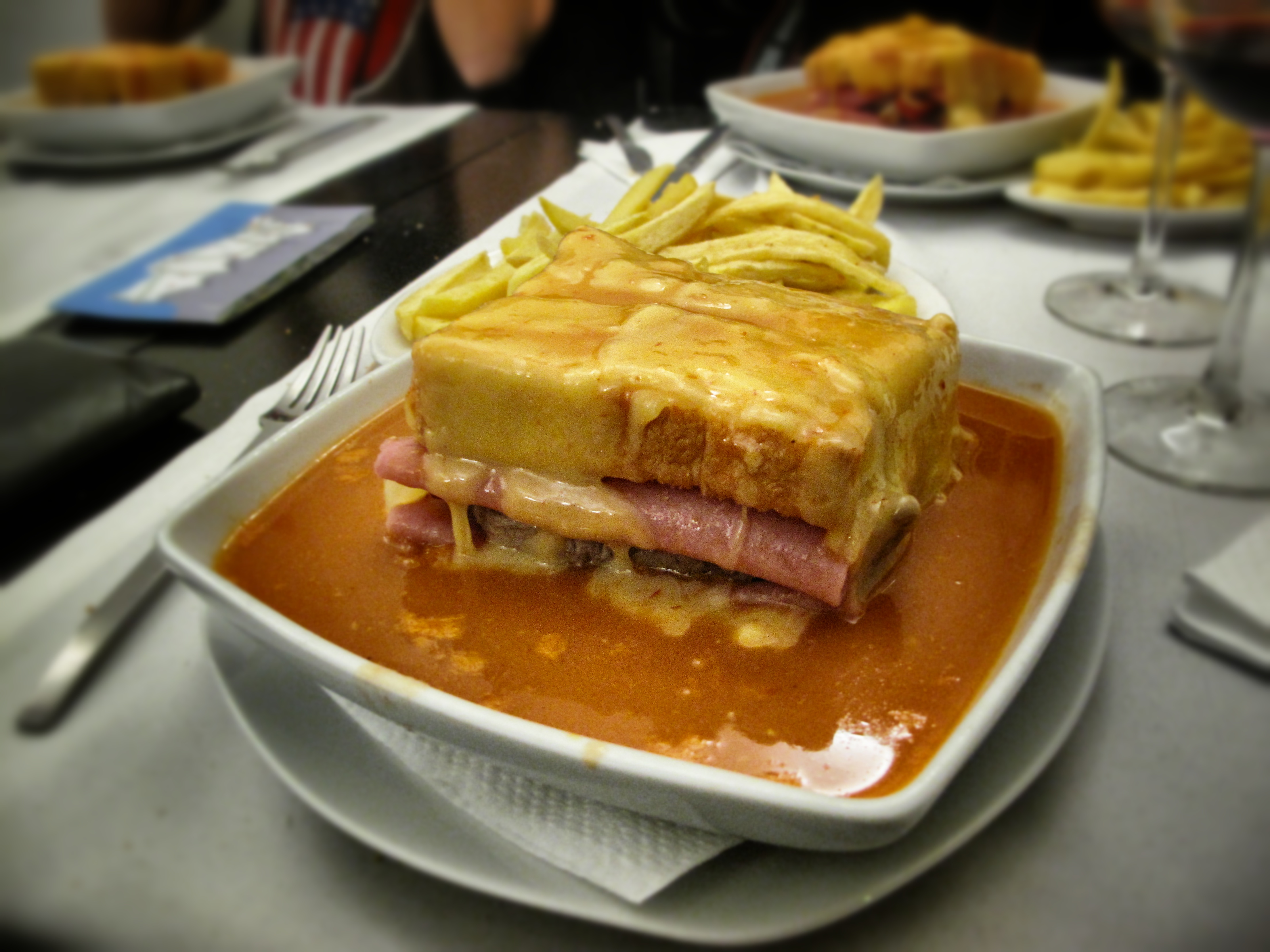 So what is it? It is a toast with different kinds of meat in a cheese crust dunked into tomato/wine sauce (with about 2331859 calories). I’ve never heard of it before, and the story behind it is kind of great: In the fabulous 1920s, a man from Portugal once traveled to Paris and liked all the beautiful girls there (get it). That was a contrast for him as he only knew the not-so-outgoing (very catholic country) and skinny Portuguese girls. So he invented the Francesinha – small French – to make the Portuguese girls gain some weight and make them all hot 🙂 I guess it worked out quite well.