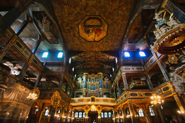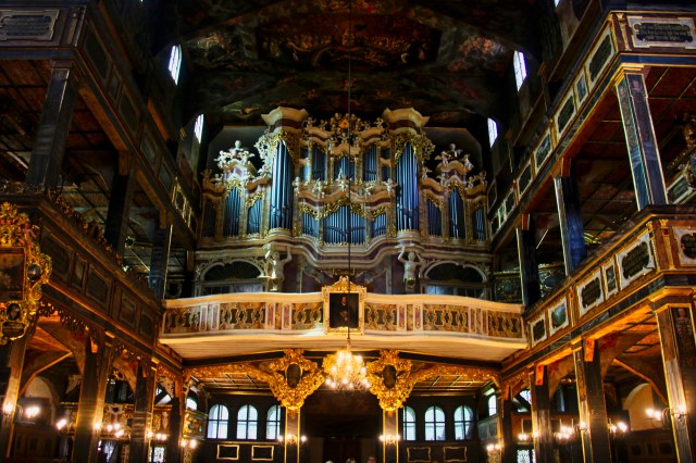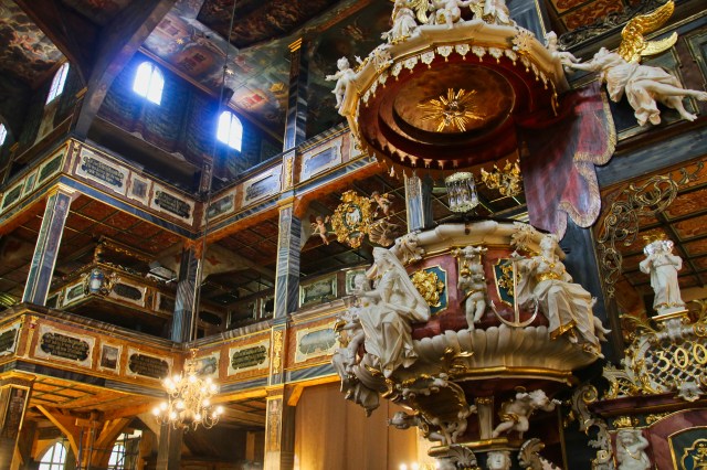 The evangelical Church of Świdnica in southern Poland is truly something extraordinary. It was built after the Peace of Westfalen (hence called Church of Peace), which followed a long battle between Catholics and Evangelicals in the German-speaking countries. The Catholic emperor Ferdinand II. won, but he had to make some concessions to the evangelical communities. Some reformed communities were allowed to build their own churches, but only outside the city walls, and they had to be constructed almost entirely of wood within one year. Three communities rose to the occasion, and two churches from the early 18th century still exist, the one in Świdnica being the largest and most opulent. Since 2001, the sacral building has been a UNESCO World Heritage sight.