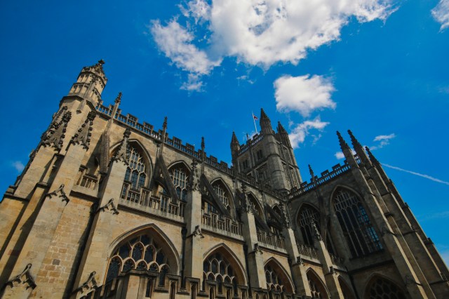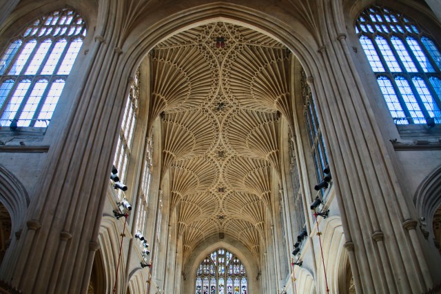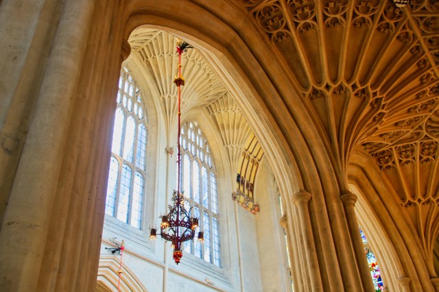 The Abbey of Bath is a prime example of England’s Pendicular Gothic architecture style. Another would be the Cathedral of Gloucester. Medieval churches tend to be very dark and somewhat sinister. The Abbey of Bath, though, is different. The light coming through the beautiful stained glass windows flows through the building, giving attractive accents and tones.