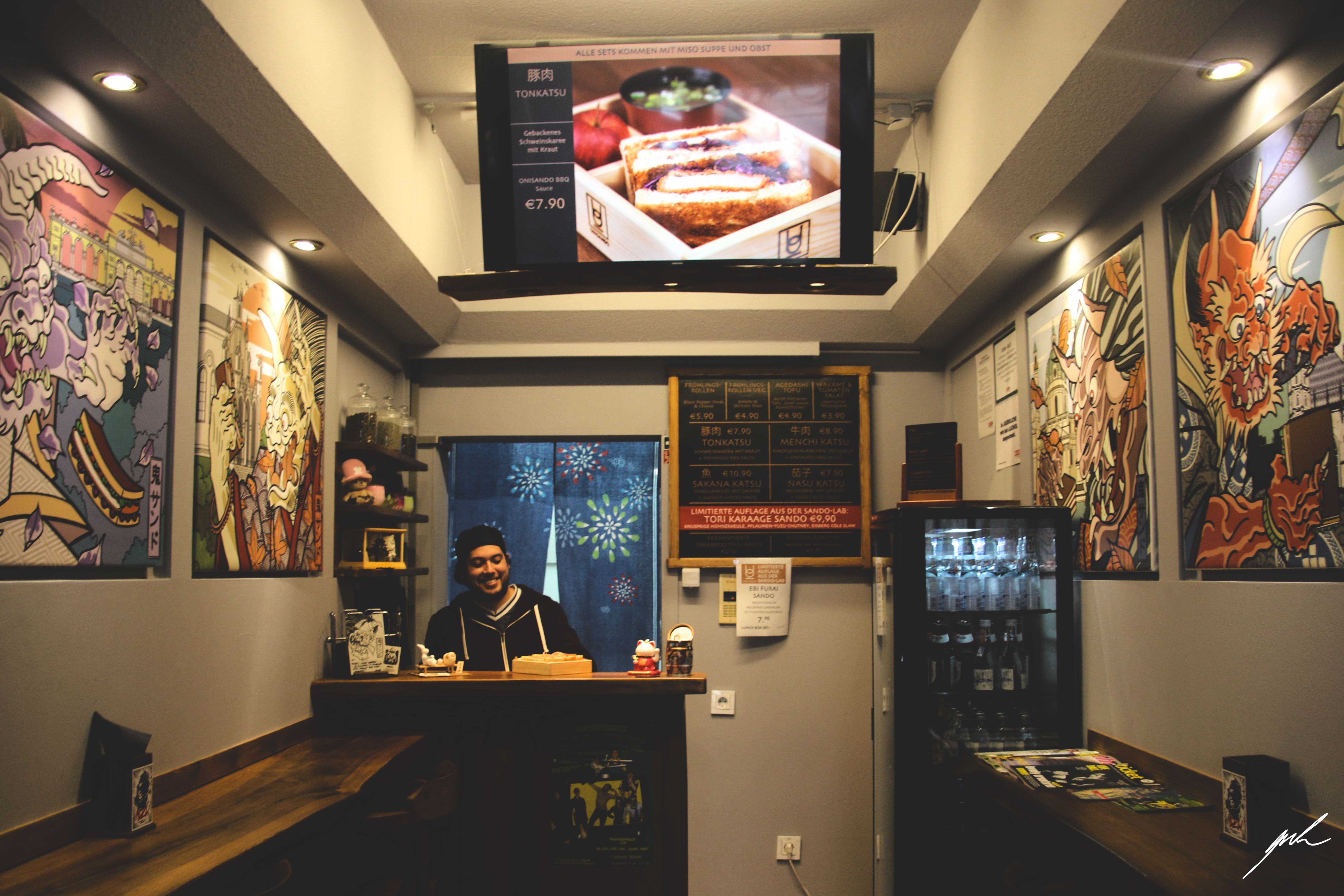 And that’s precisely what you get at Onisando for prices around 7 to 10 Euro for a set with Miso soup and apple. There are a couple of staple sets with meat, vegetarian, and dish options and limited editions, which change around twice a month. I got to try a delicious Matcha dessert, which is still in development and has not yet been finalized (last picture). The general style of the shop is exciting too. It’s pretty minor and cozy and, hence, very Japanese. But the art envisioned by the Polish artist NDZW merges Austrian with Japanese culture by placing Katsu sandwiches in different very Viennese spots – like, for example, the Ferris wheel Riesenrad. Notable are the strict geometric forms you often see in the land of the rising sun.