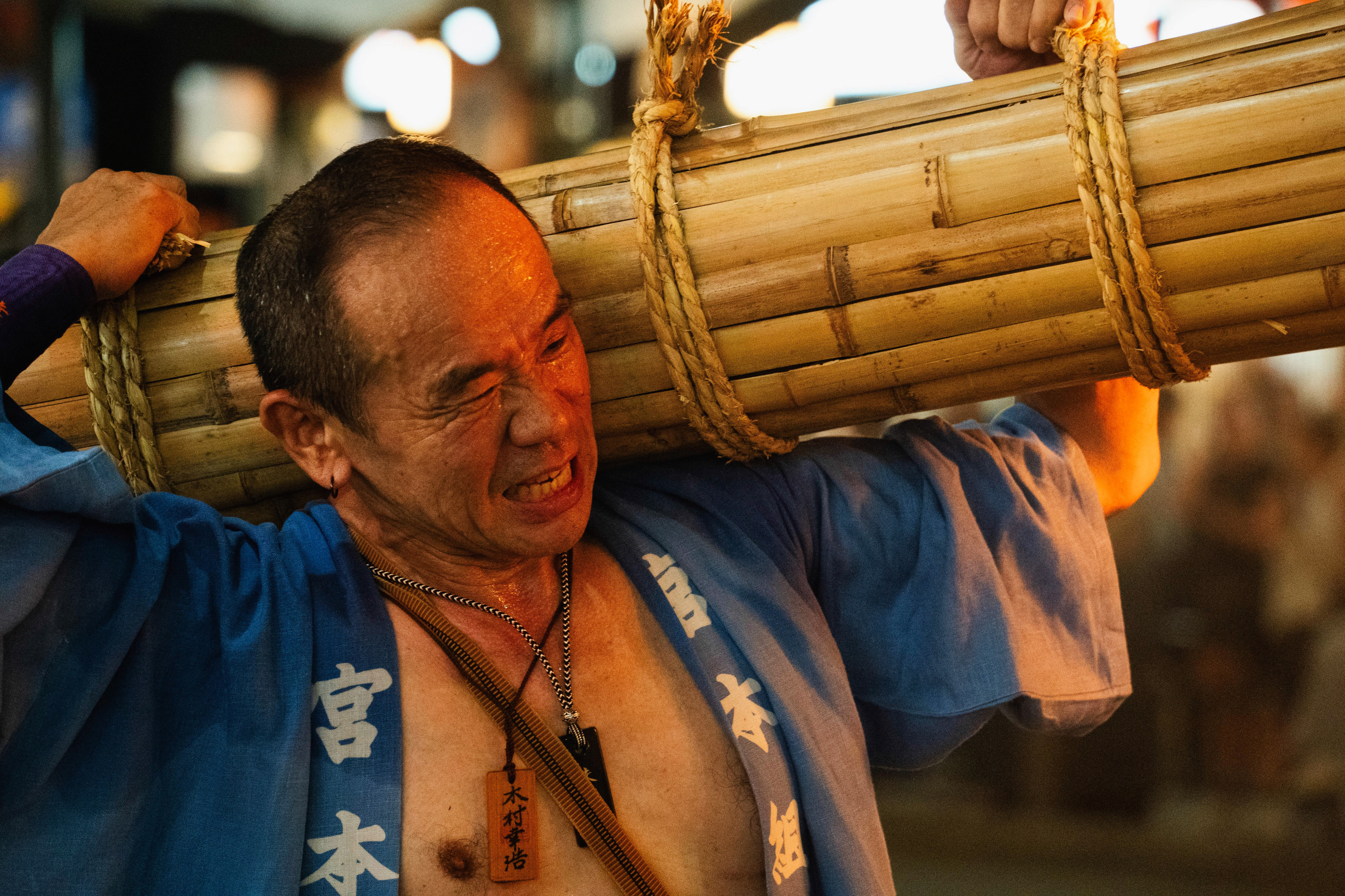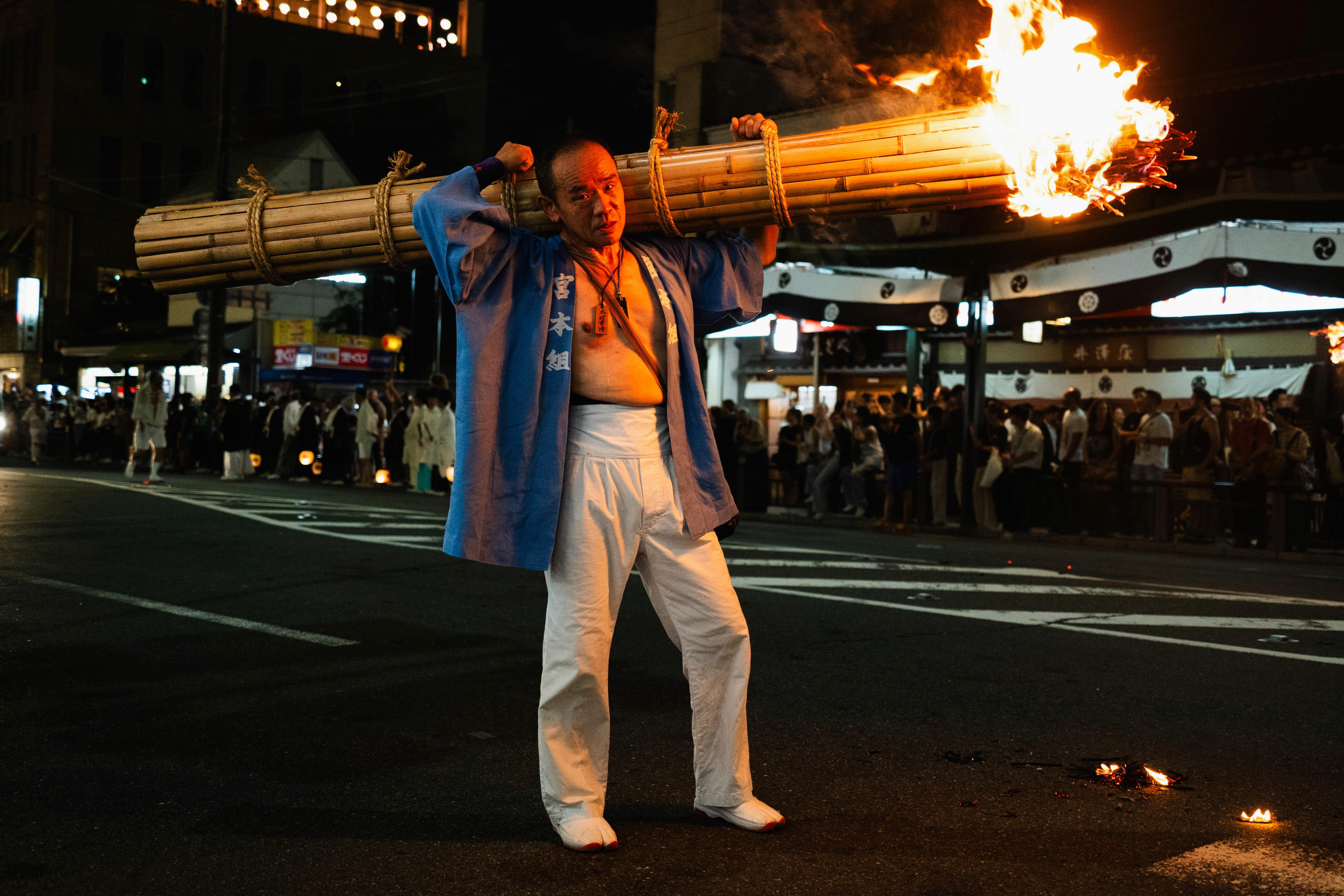 This ritual is more than spectacle—it’s a powerful act of devotion and cleansing. As the bearers chant and march through the humid summer night, sparks fall like brief stars onto the pavement. The heat, the smoke, and the physical exertion create a trance-like atmosphere, both for the participants and those watching. In this elemental moment, fire becomes a bridge between Kyoto’s past and present—a symbol of protection, transformation, and enduring tradition woven into the fabric of the Gion Matsuri.